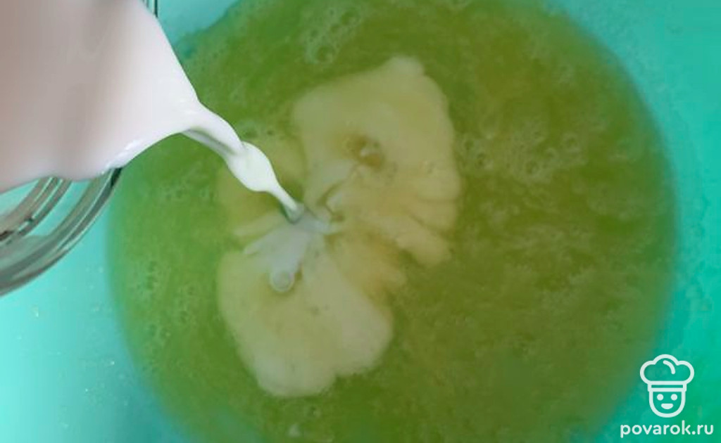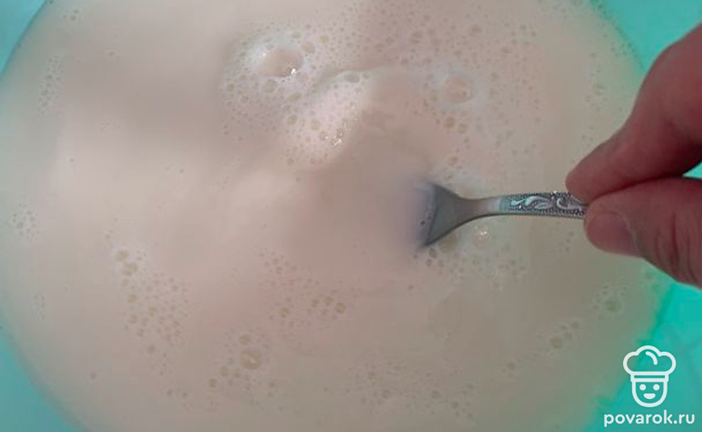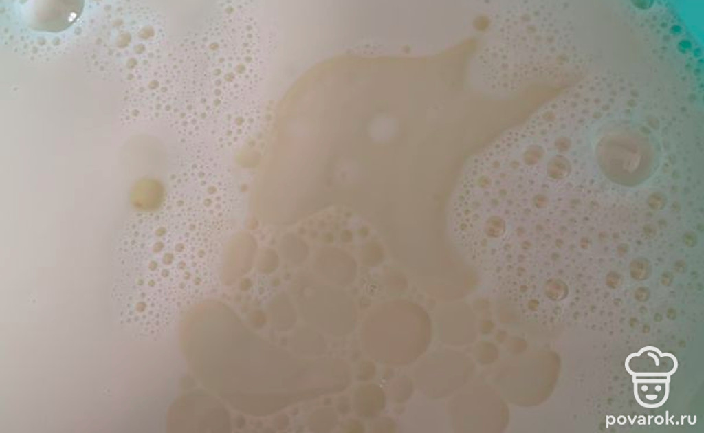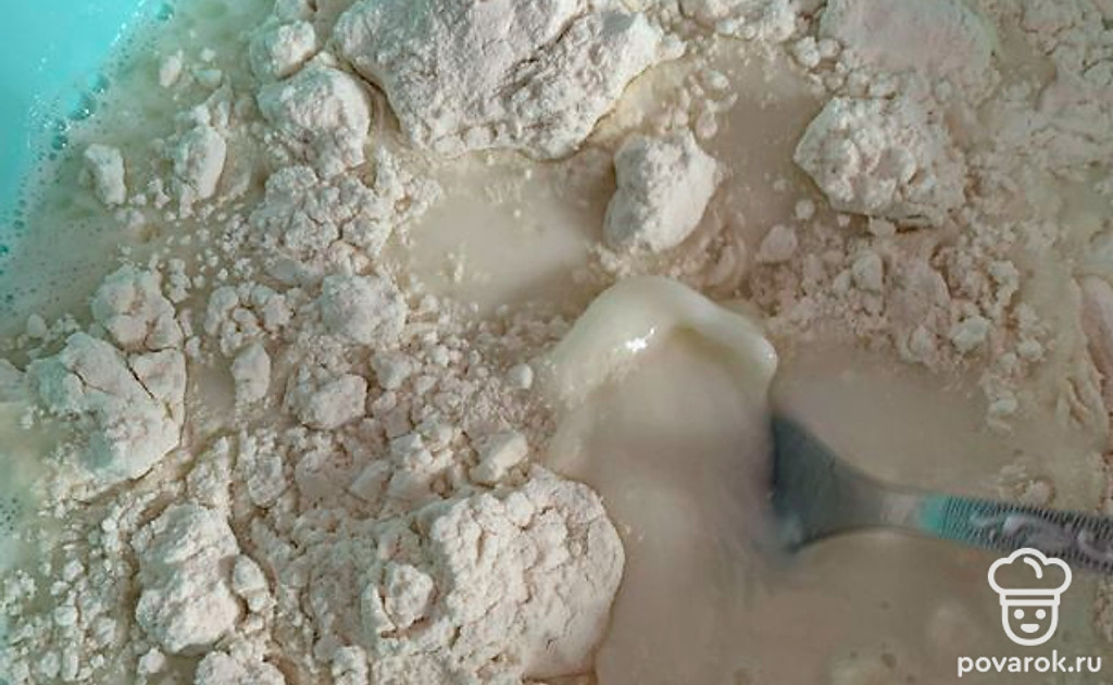 Всыпать муку понемногу и перемешать, чтобы не было комочков.