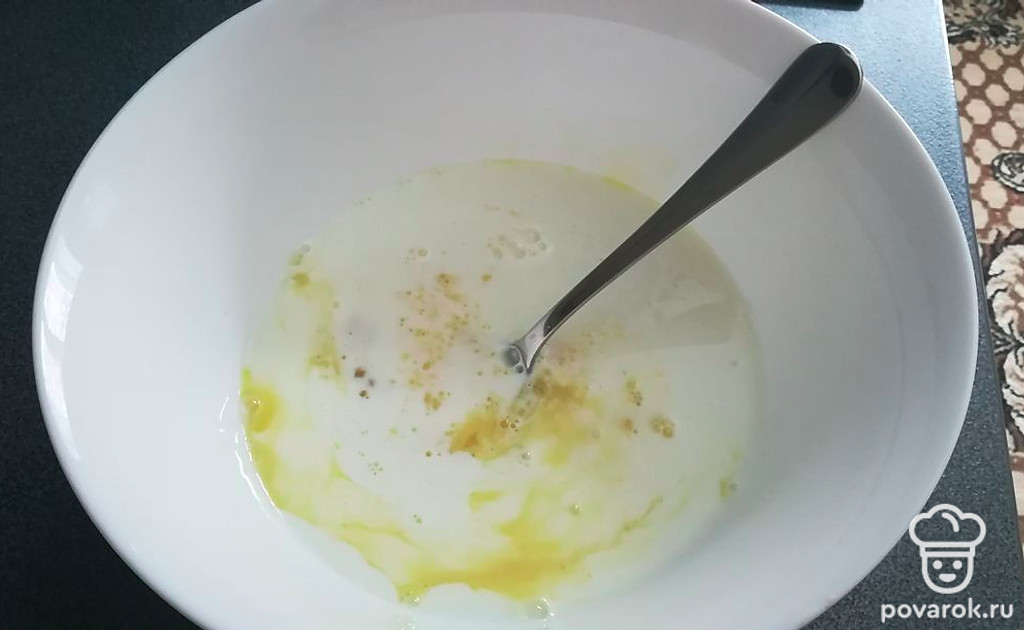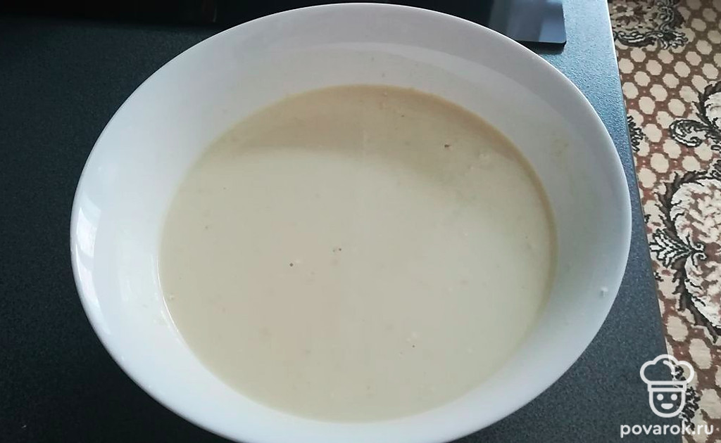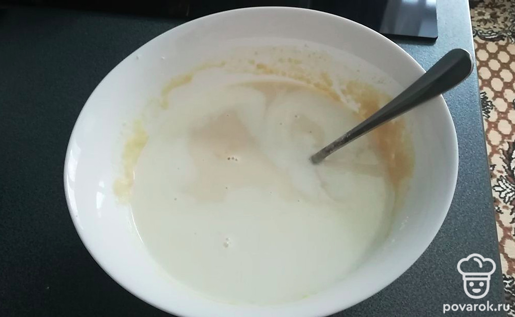 Затем постепенно добавлять молоко и воду и разбавлять смесь.