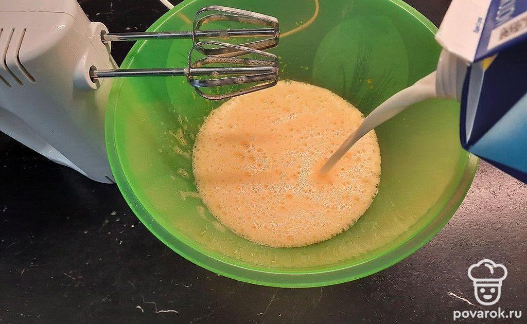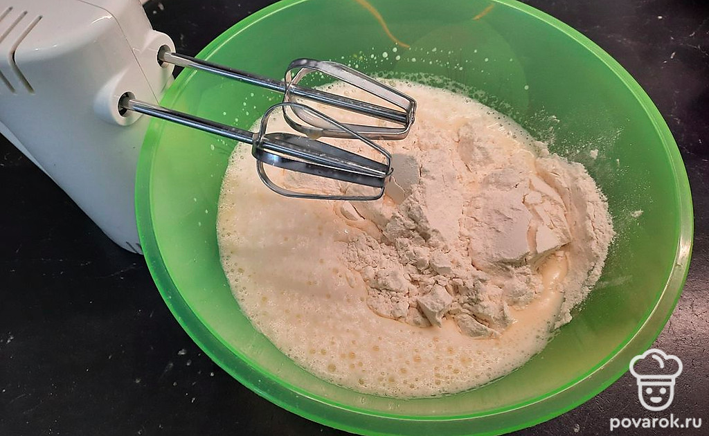 Добавляем муку, перемешиваем чтобы не осталось комочков. Добавляем в тесто 20-30 грамм подсолнечного масла.