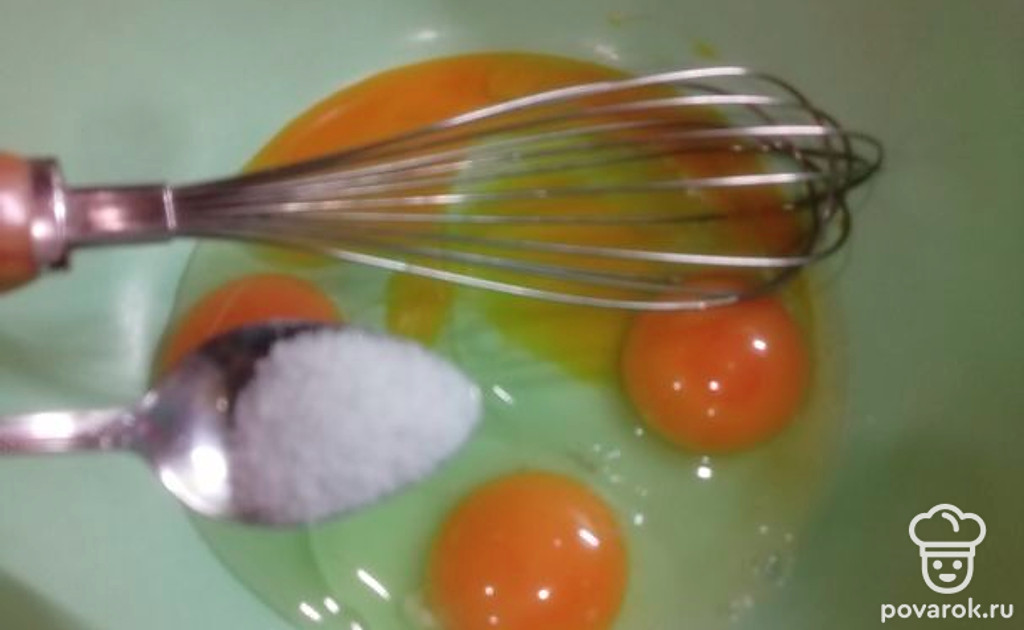 В миску разбиваем яйца. Добавляем соль. Все взбиваем венчиком.