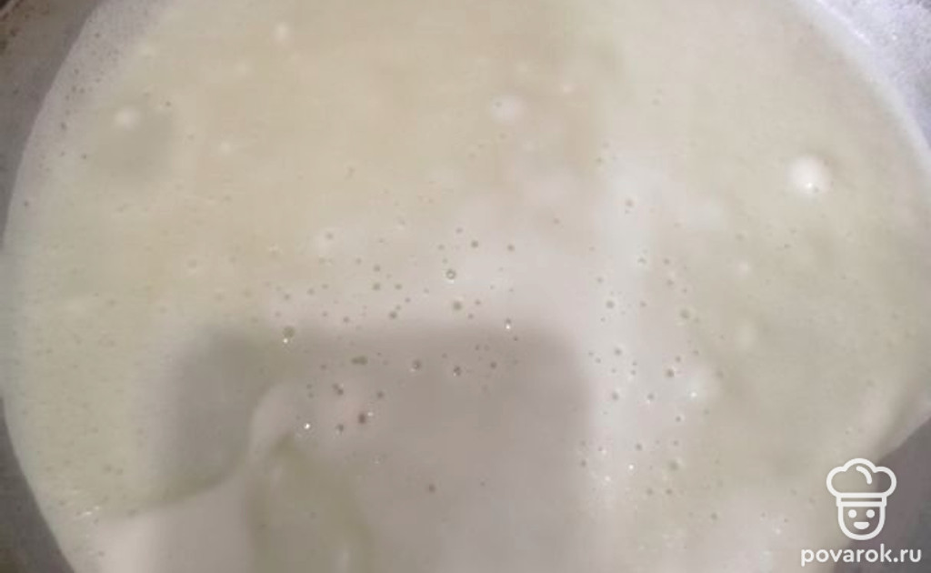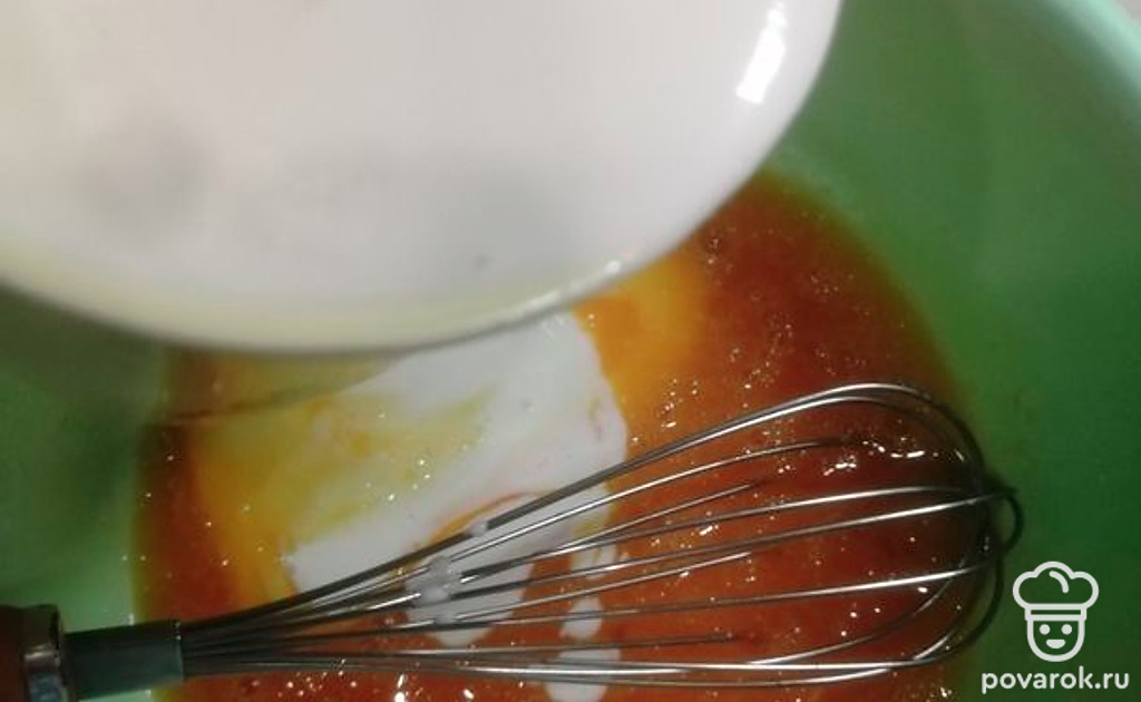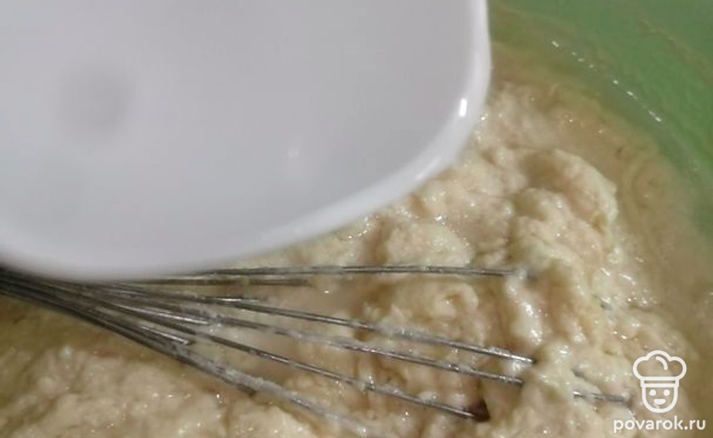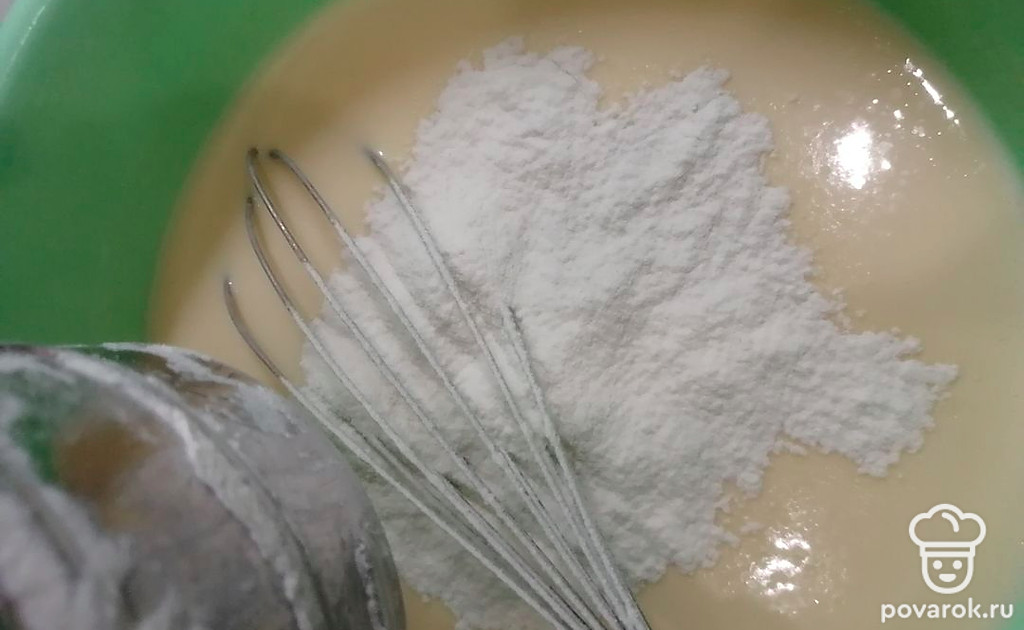 В эту смесь всыпаем просеянную муку. Всё хорошо перемешиваем, чтобы не было комочков. Тесто должно быть консистенции густой сметаны.
