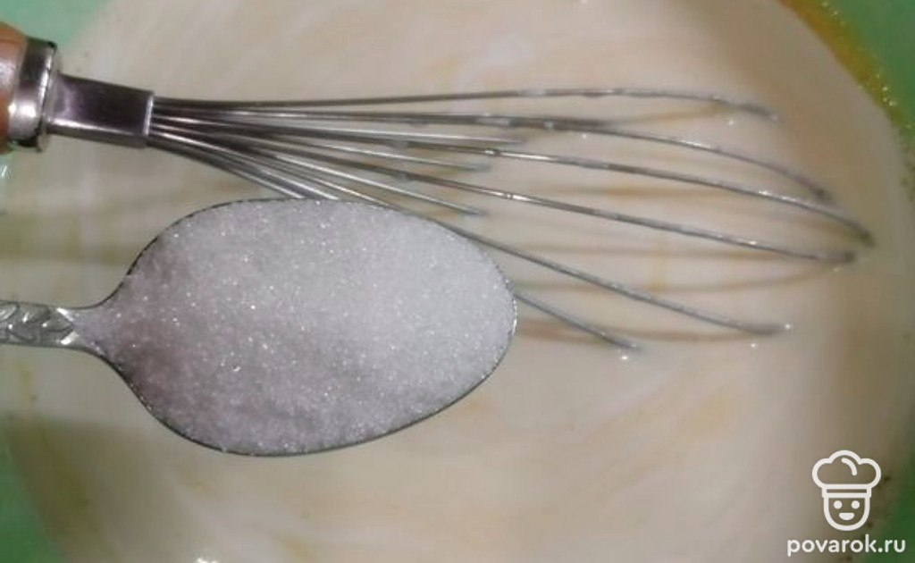 Кладём сахар. Если хотите сладкие блинчики добавьте песка побольше. Все перемешиваем.