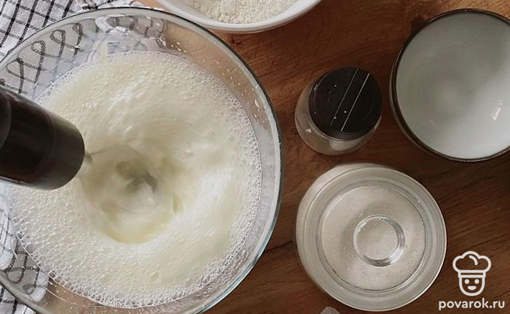 Смешиваем яйца и сахар, взбиваем блендером или миксером.
