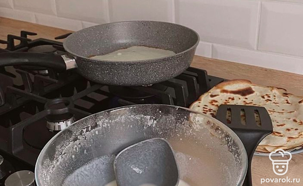 Хорошо разогреваем сковородку! Прямо очень очень сильно разогреваем, смазываем немного маслом и выпекаем вкусные блинчики.