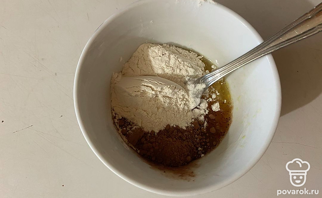 Затем к яичной смеси добавьте муку и какао-порошок.