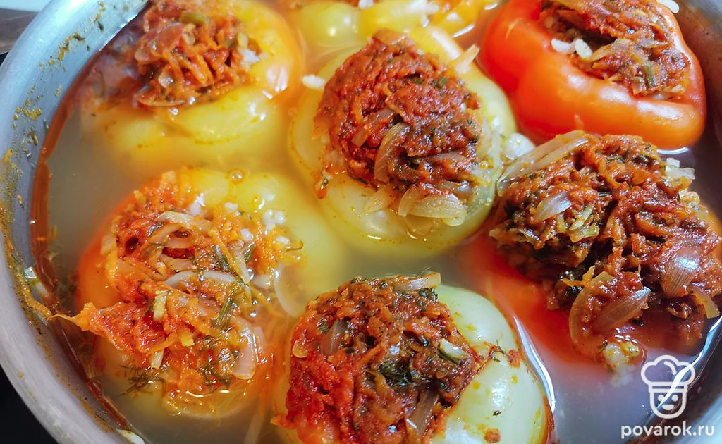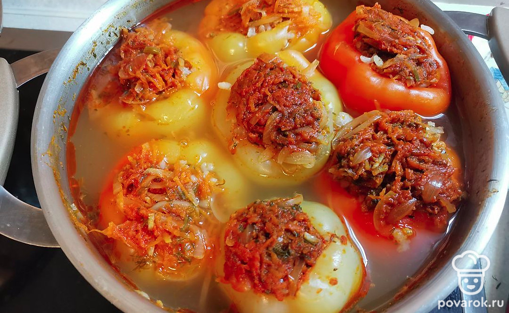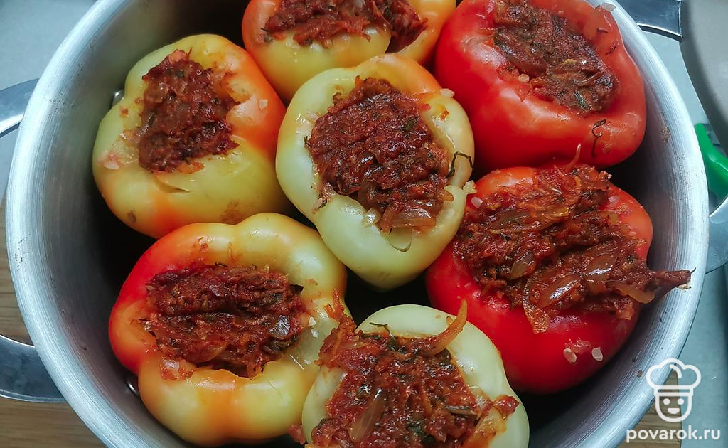 Оставшуюся зажарку разложить шапочкой на перцы.