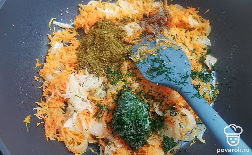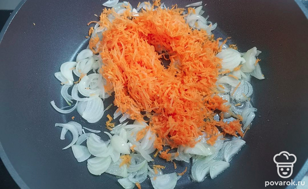 Лук нарезать полукольцами, морковь натереть на мелкой терке. Обжарить на растительном масле до мягкости.