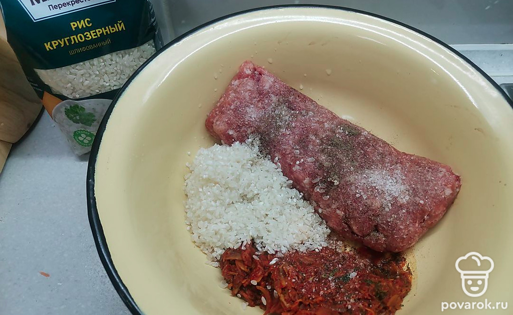 Для начинки соединить фарш, 2/3 зажарки и промытый рис. Посолить и поперчить, хорошо перемешать.