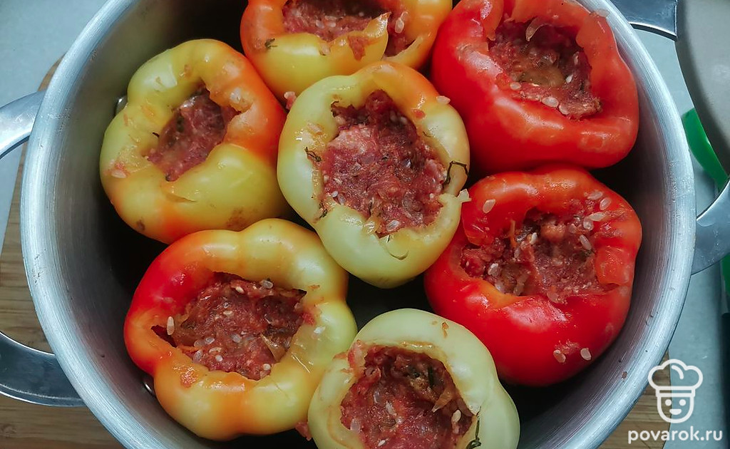 У перцев вырезать плодоножку и сердцевину, нафаршировать. Выложить в кастрюлю.