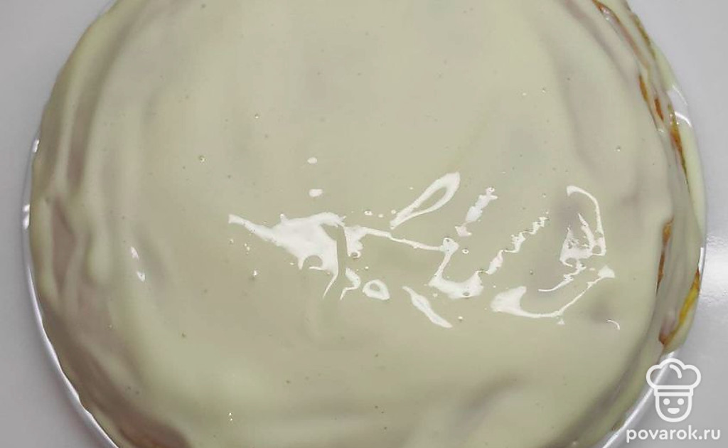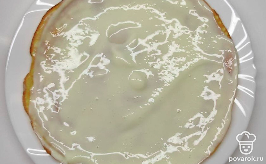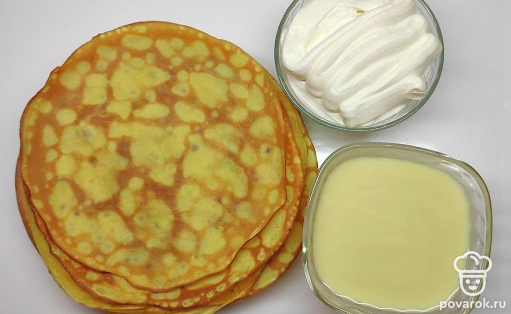 Готовые тонкие блинчики промажьте лопаткой или ложкой плотным кремом, который готовится из смеси всего двух ингредиентов – сметаны и сгущенного молока. Блины выкладывайте друг на друга. В конце верх и бока будущего торта щедро смажьте остатками крема.