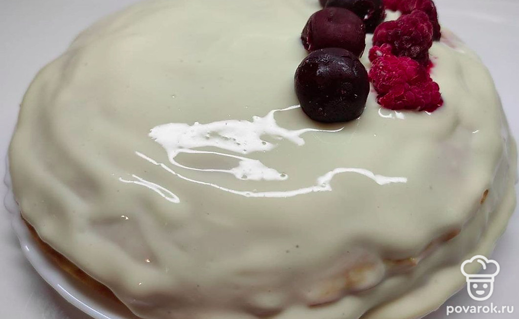 Торт украсьте ягодами, которые имеются в наличии. Разделите на порционные кусочки и подайте к столу.