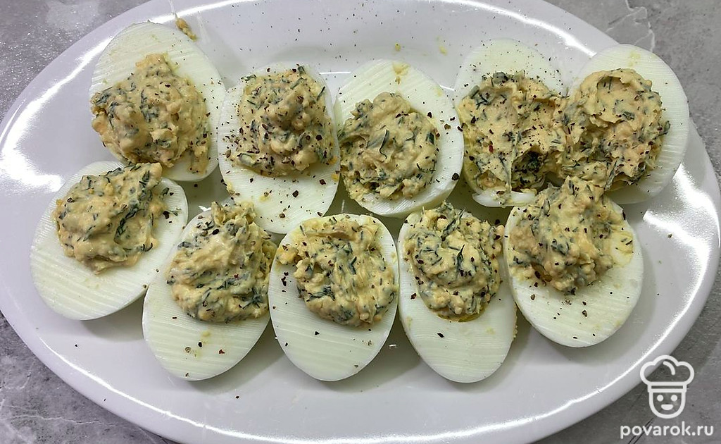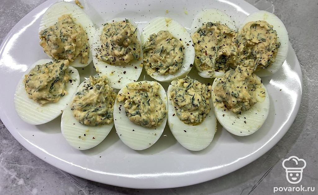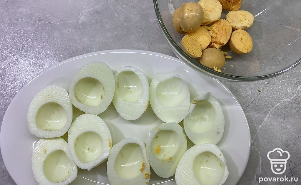 Яйца остудите, очистите от кожуры, разрежьте пополам. Отделите желтки от белков.