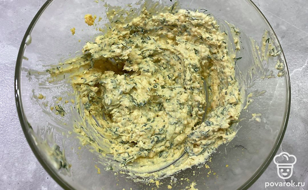 Желтки измельчите вилкой, добавьте майонез, мелко нарезанный укроп, соль и перец. Хорошо перемешайте.