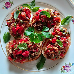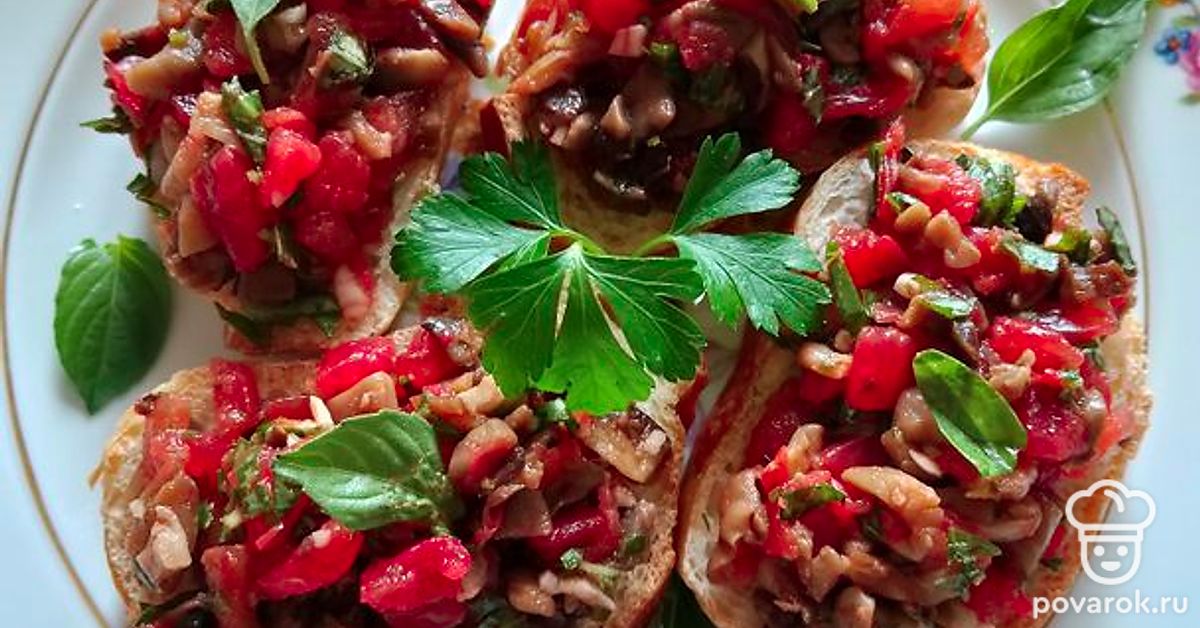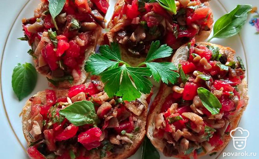 Натереть кусочки багета половинкой чеснока, выложить томатную начинку, украсить листиками базилика. Приятного аппетита.