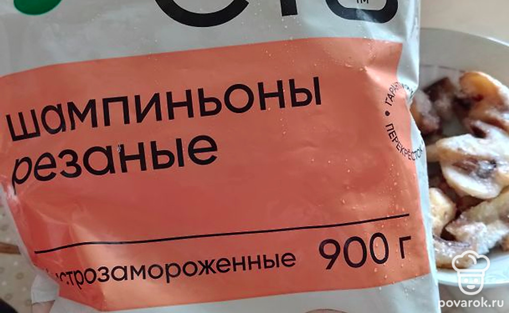 Шампиньоны разморозить, обжарить на оливковом масле до испарения жидкости.