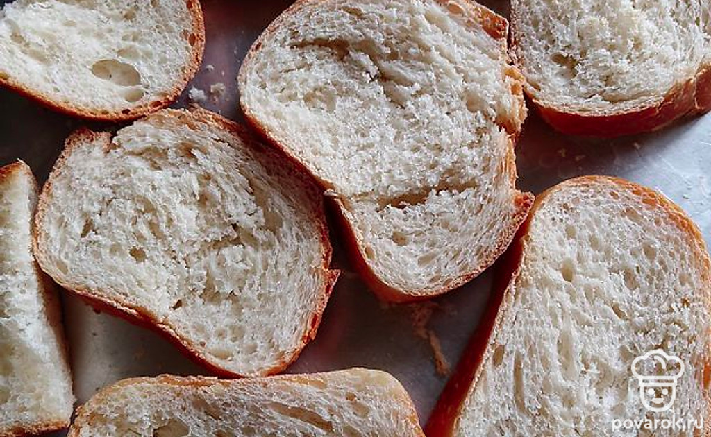 Разогреть духовку. Подсушить хлеб с двух сторон.