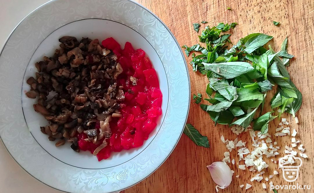 Помидоры очистить от кожицы и семян, нарезать небольшими кубиками. Добавить обжаренные грибы. Нарезать свежий базилик, чеснок измельчить. Соединить все в тарелке. Посолить и поперчить, хорошо перемешать.
