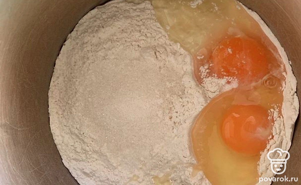 Яйца, соль, сахар и муку тщательно перемешиваем.