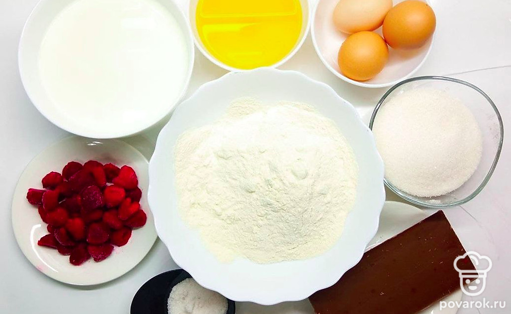 По отдельным удобным вам тарам расположите все необходимые ингредиенты: муку, яйца, растительное масло, сахар, разрыхлитель, соль. В отдельную миску или стакан налейте молоко.