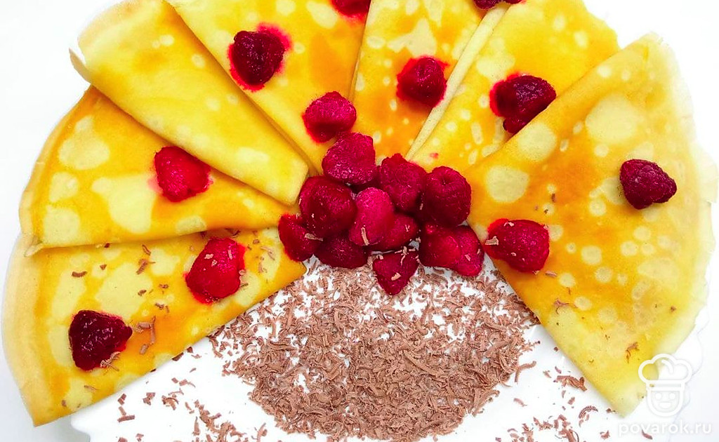 Готовые блины разложите по блюду, украсьте их шоколадом и ягодами.