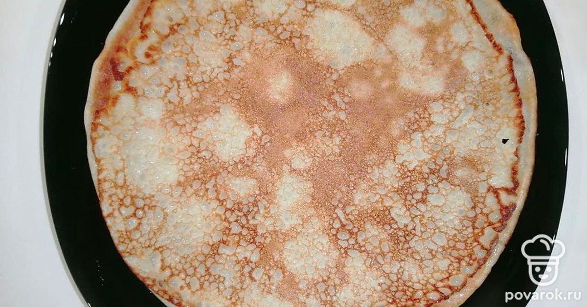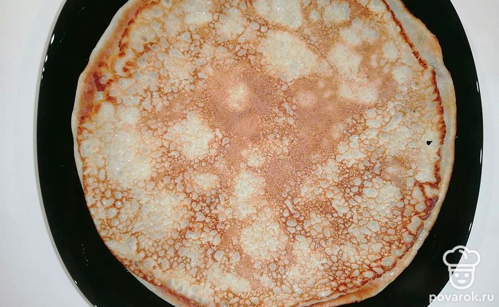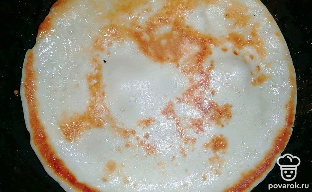 Разогрейте сковороду на среднем огне и смажьте небольшим количеством масла. Влейте немного теста половником и распределите массу по всей сковороде. Обжаривайте до золотистости с каждой стороны.
