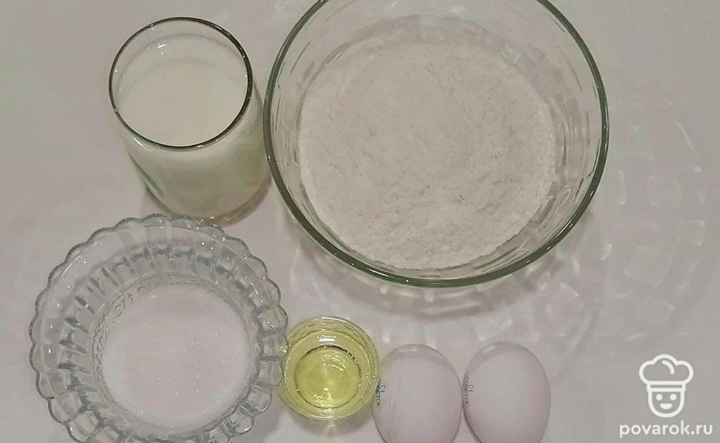 Налейте молоко в стакан. Насыпьте муку и сахар по тарелкам. Подготовьте яйца и масло.