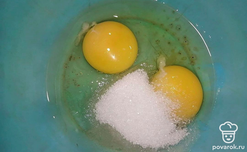 В глубокую миску вбейте яйца. Засыпьте сахар и с помощью венчика взбейте смесь.