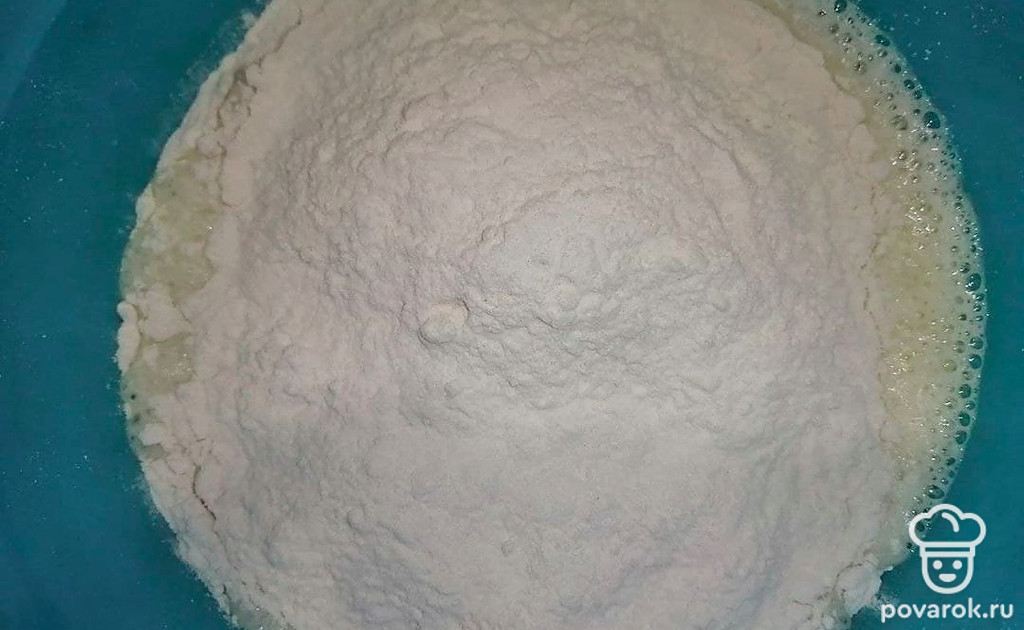 Влейте молоко постоянно помешивая засыпьте муку. Замесите однородное тесто. По консистенции оно должно быть как густая сметана.