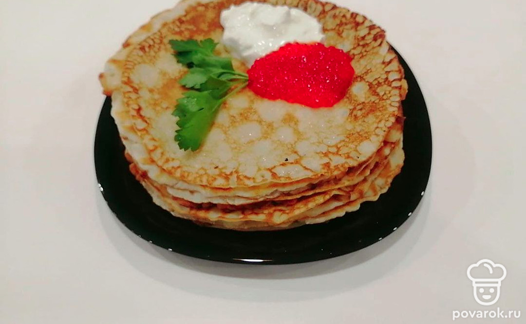 Готовые блины сложите в стопку и украсьте красной икрой, сметаной и веточкой петрушки.