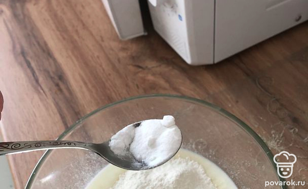 Просеять муку и добавить соду. Все хорошо перемешать.