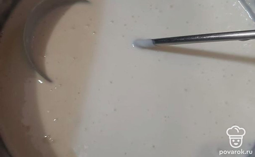Отдельно смешайте яйцо, сахар, кефир (тёплый), ванилин. Добавьте в полученную смесь подготовленную ранее муку. Дайте постоять тесту 5 минут.