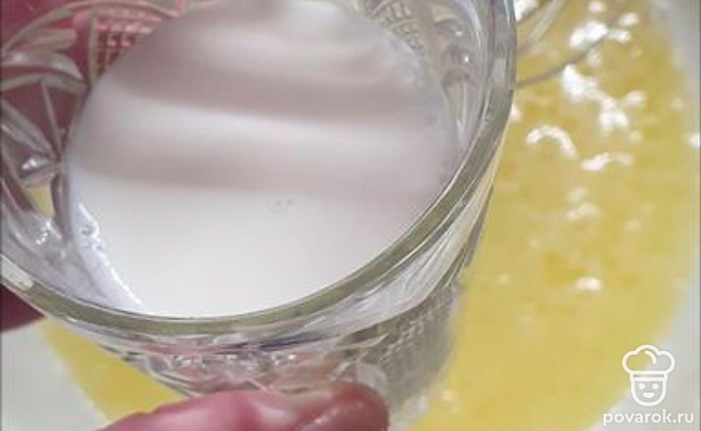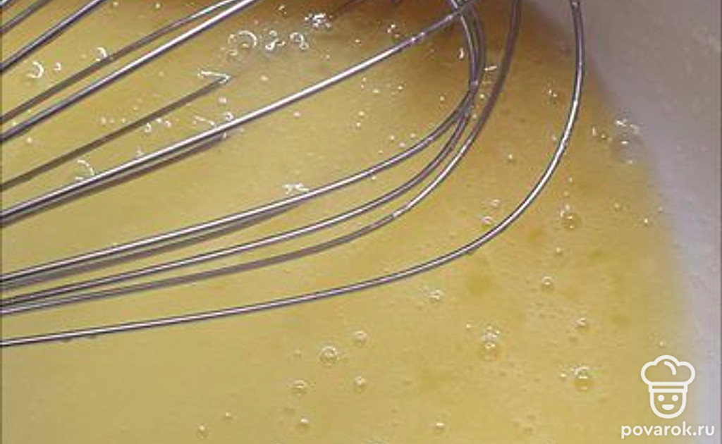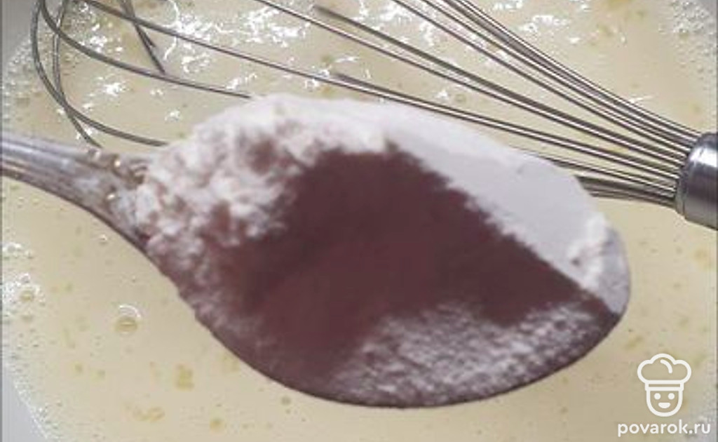 5 столовых ложек муки просеить и взбить с молоком и яйцом.