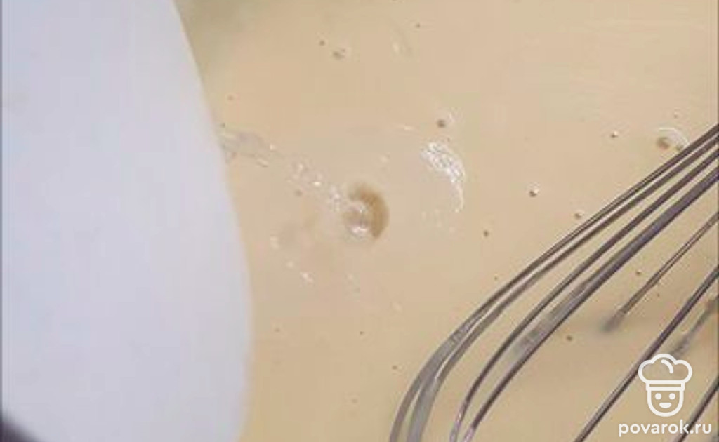 Вскипятить 50 миллилитров воды и тонкой струйкой влить в блинную смесь. Аккуратно перемешать.