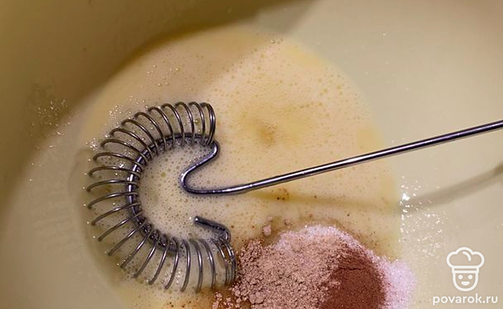 В глубокой миске смешать яйца, соль, сахар, имбирь и взбить венчиком. Добавить теплое молоко.