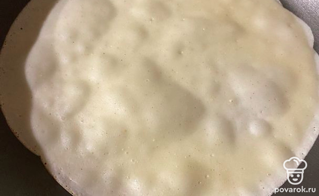 На разогретую сковороду налить тесто и распределить по всему периметру. Жарить с двух сторон до образования легкой коричневой корочки.