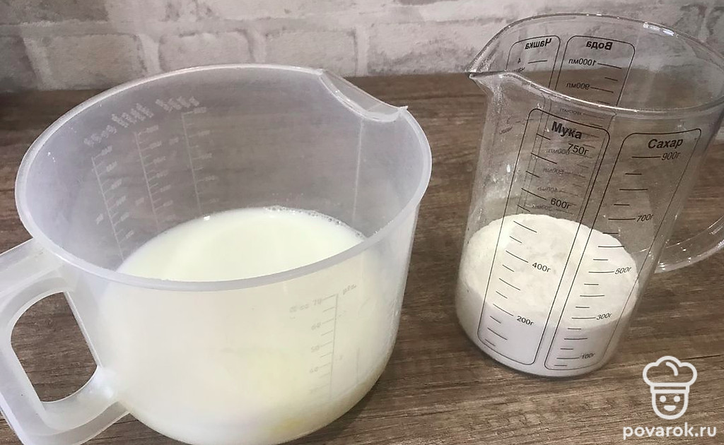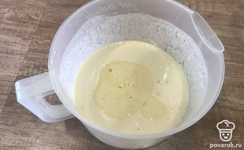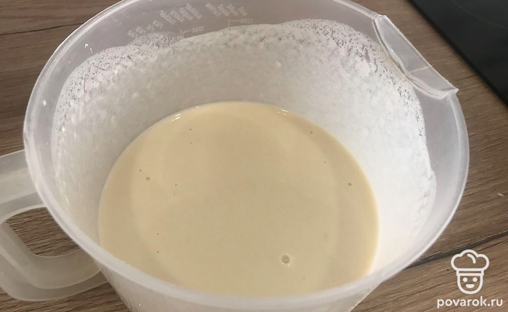 В отдельной миске смешайте яйца, сахар, соль, тёплое молоко, в конце добавьте муку и перемешивайте до однородности.