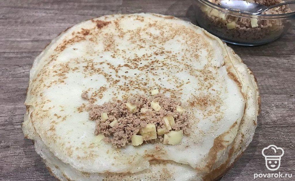 Вкусные блины с куриным фаршем и сыром