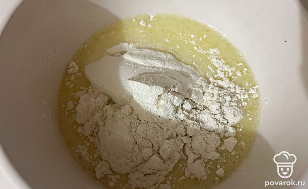 Все тщательно перемешайте и введите в смесь муку.