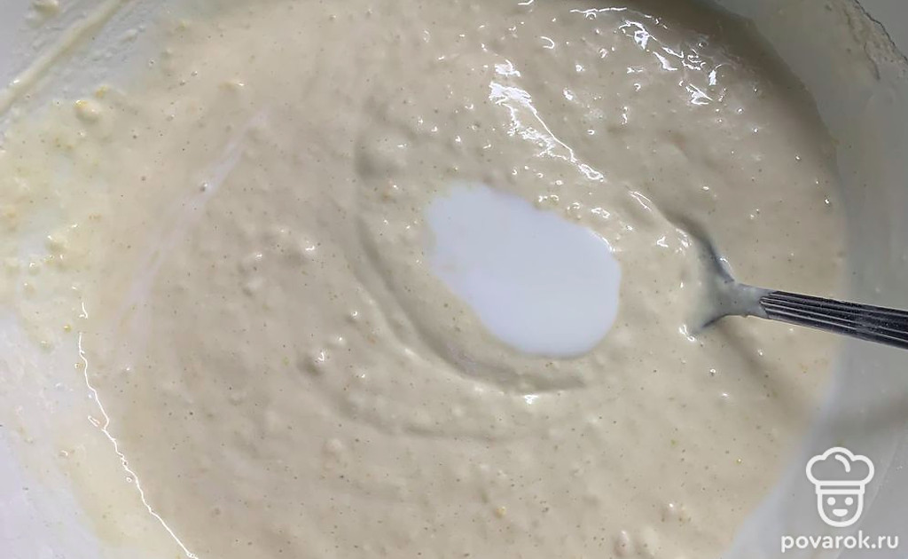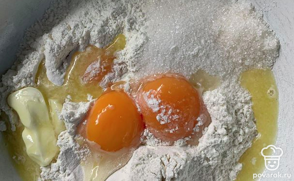 В муку добавляем желтки, соль, сахар, масло и перемешиваем.