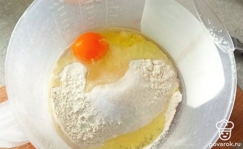 Добавьте молоко, яйцо и сахар и перемешайте. Добавляйте воду и доводите до констинстенции жидкой сметаны.