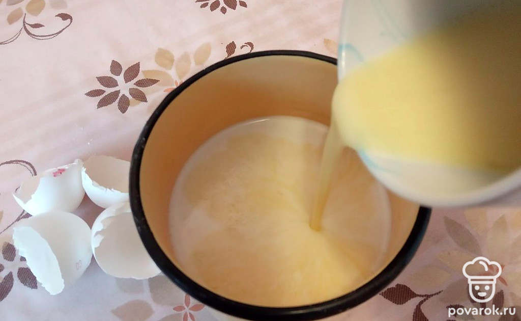 В молоко влейте взбитые яйца и масло, положите сахар, соль.