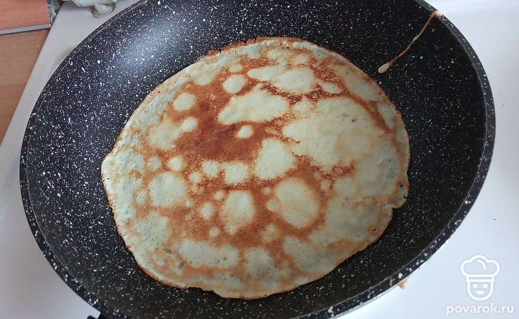 Смажьте сковороду растительным маслом, разогрейте до высокой температуры и выпекайте блины.