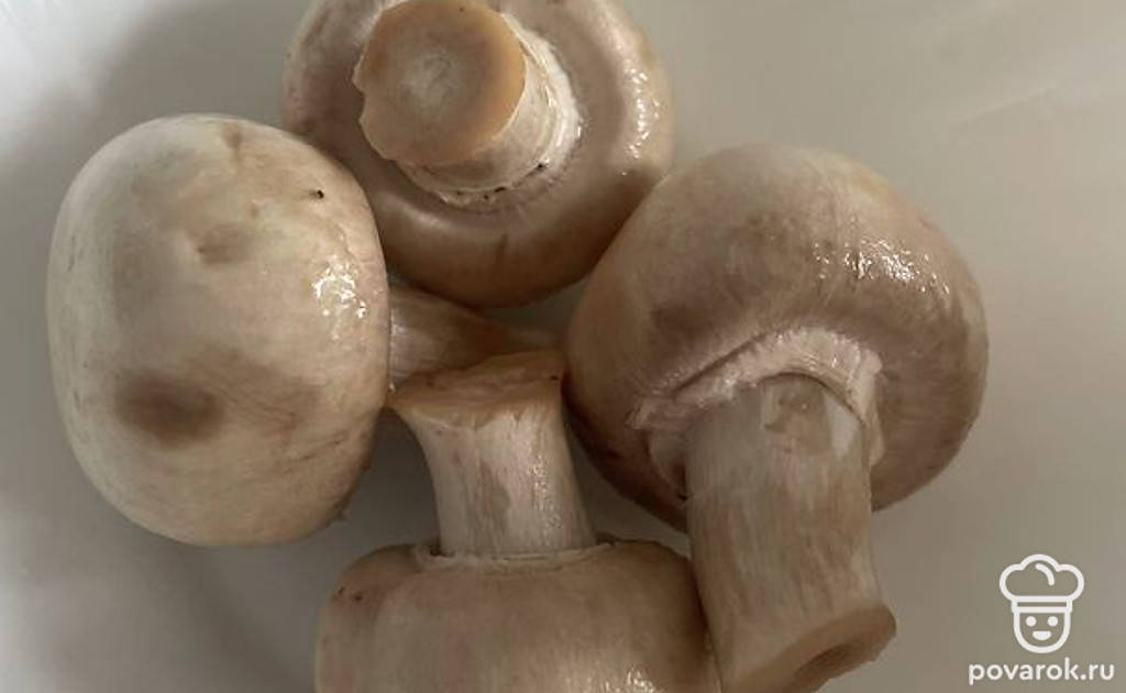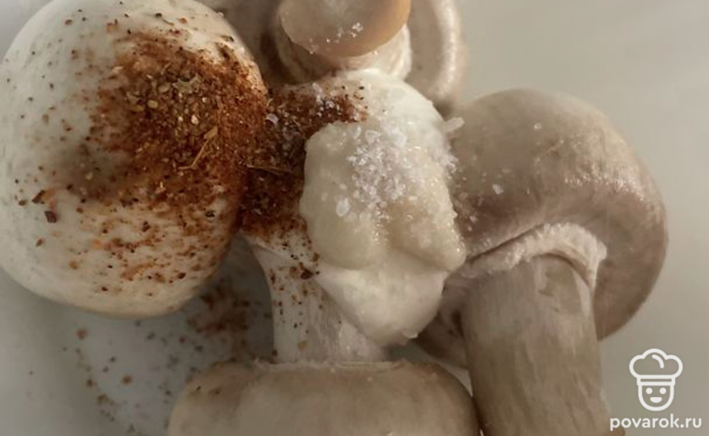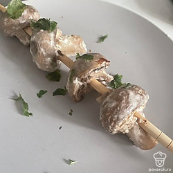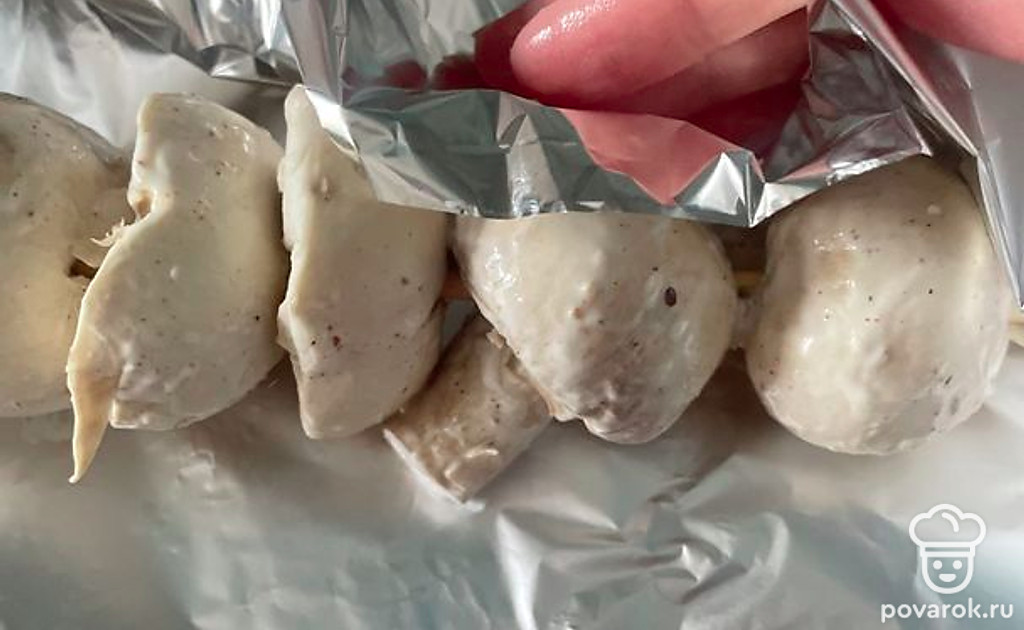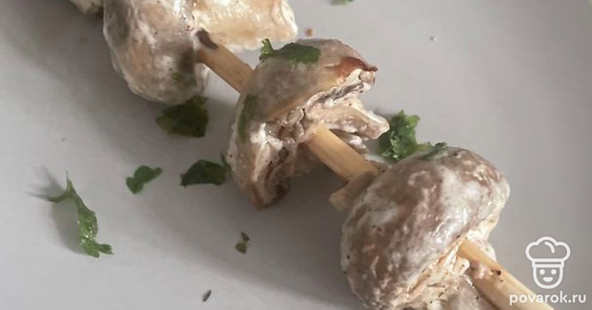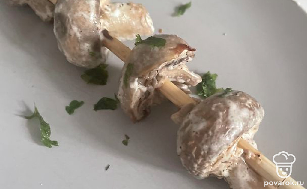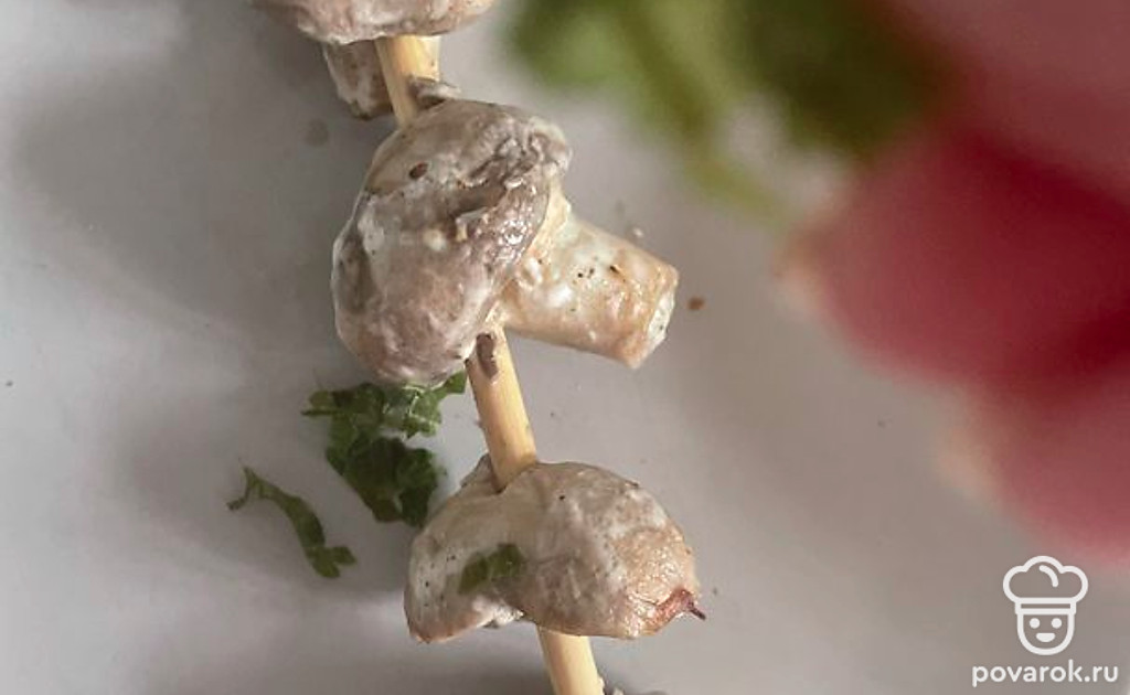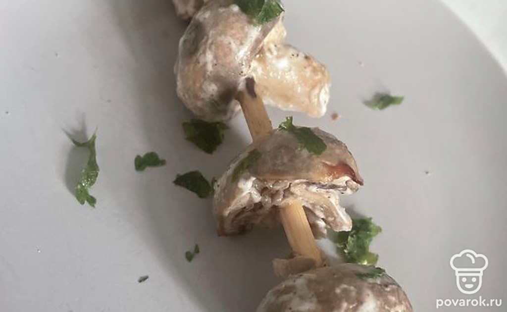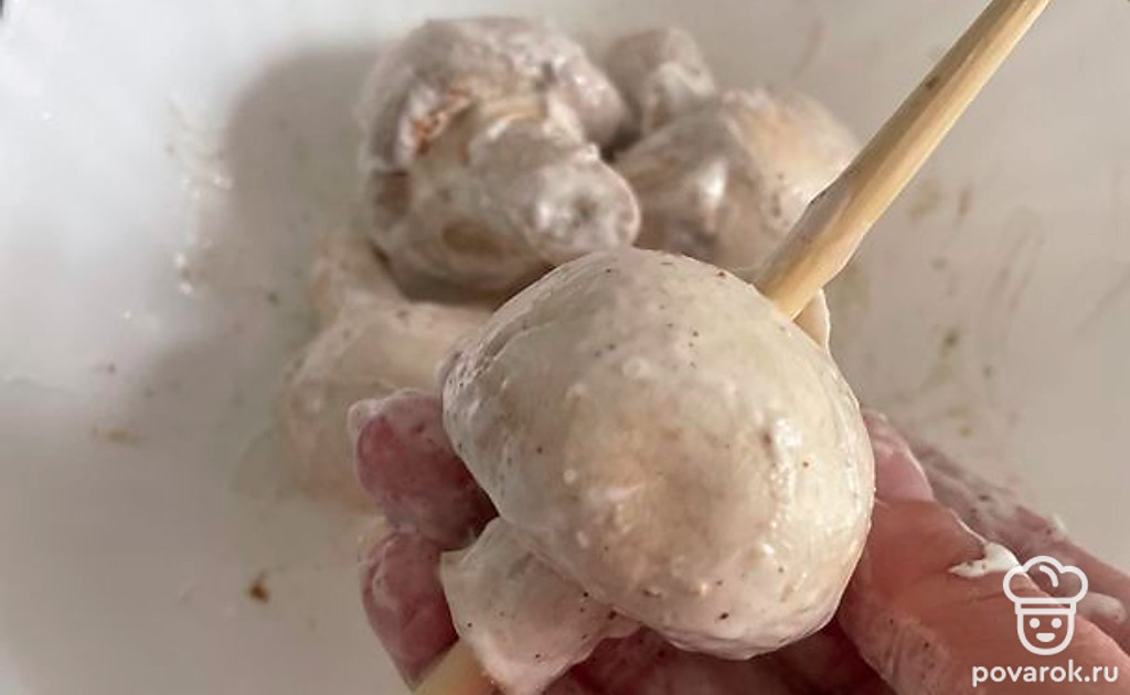 Нанижите целые шампиньоны на толстую шпажку или бамбуковую палочку.