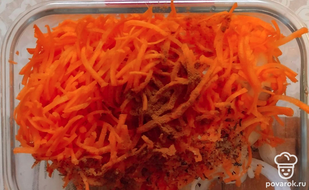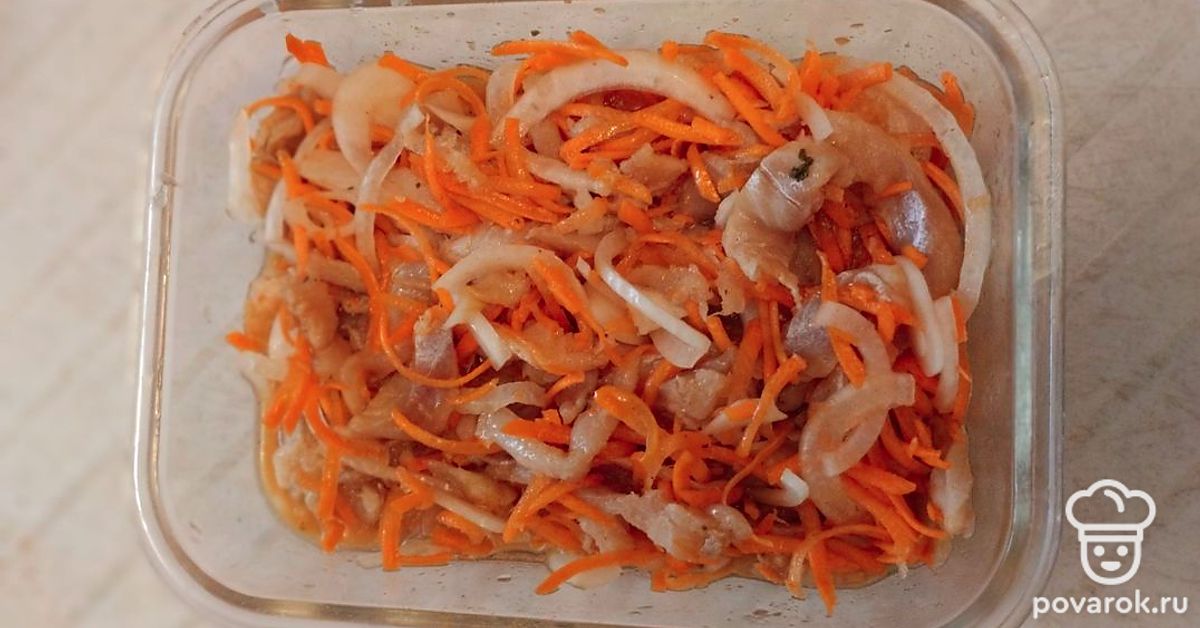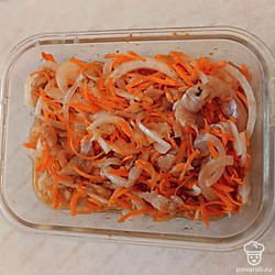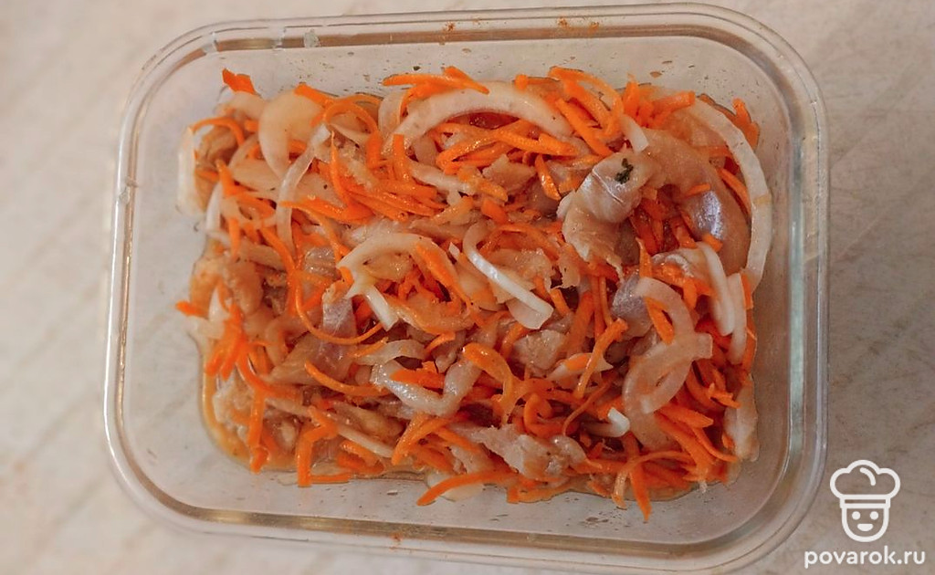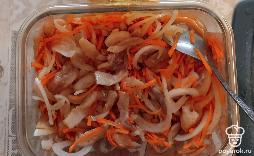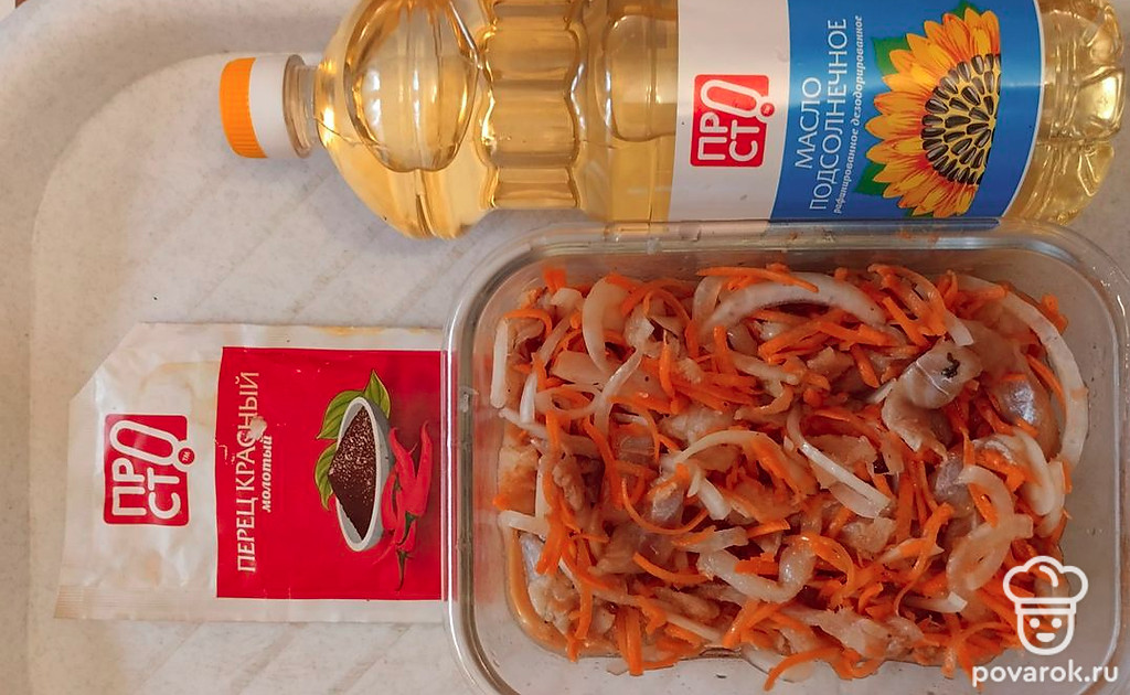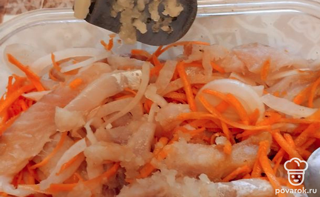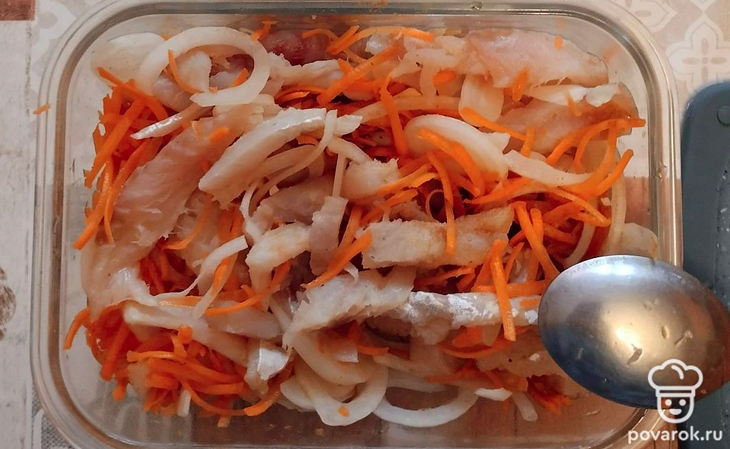 Нагреть (практически до кипения) растительное масло, вылить его к рыбе. Все хорошо перемешать. Оставить хе из минтая на 3-5 часов.