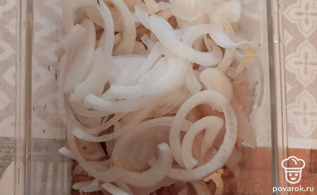 Репчатый лук нарезать полукольцами, добавить к рыбе.