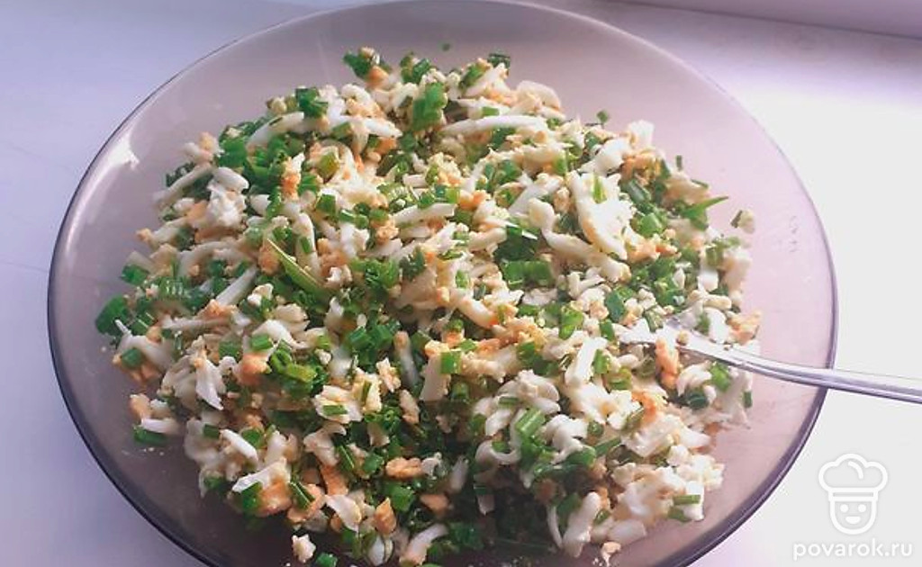 Отварить 5 яиц, остудить и измельчить. Нарезать мелко зелёный лук и смешать с яйцом, добавив 1 столовую ложку подсолнечного масла и соль по вкусу.