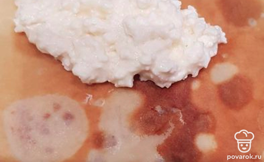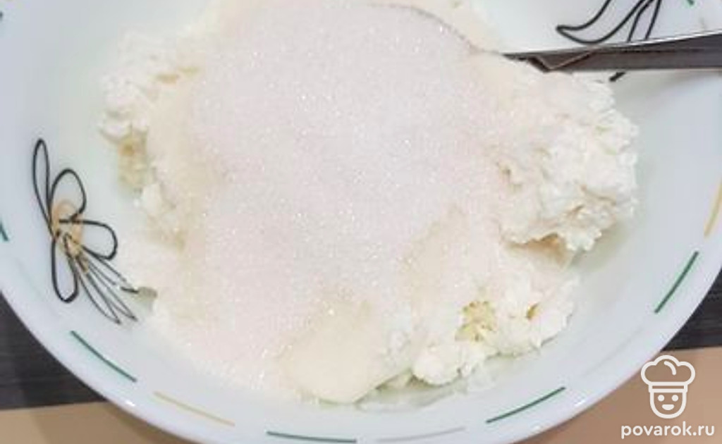 Делаем начинку: в творог добавляем сметану и сахар, перемешиваем.