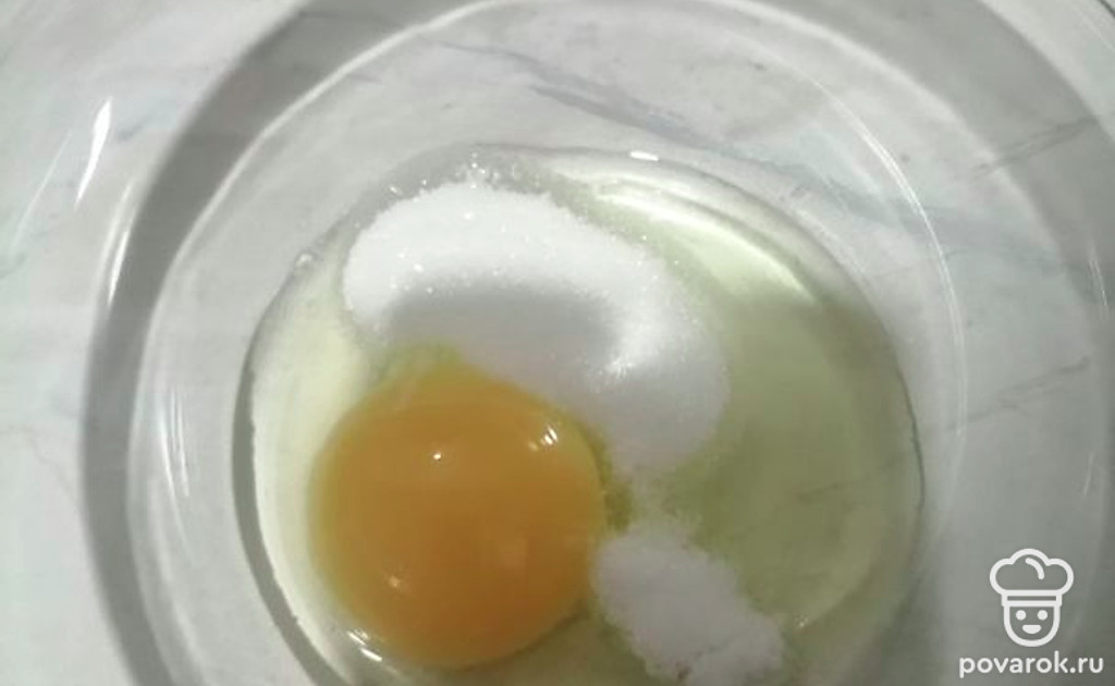 Разбиваем яйца. Добавляем 2 столовые ложки сахара и 1 чайную ложку соли.