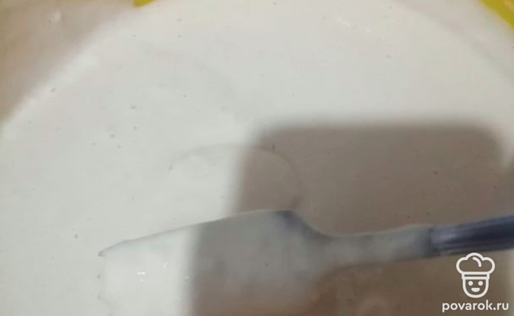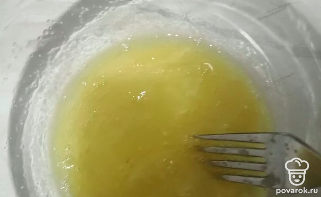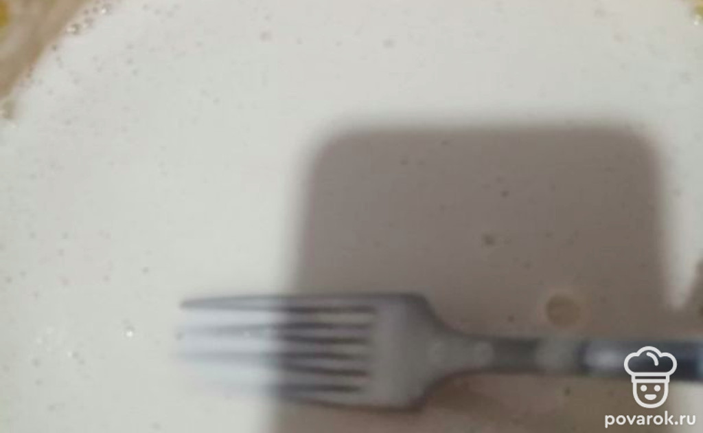 Смешиваем. Тесто получается жидкое: сквозь вилку пропускается.