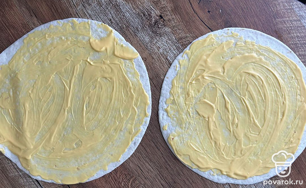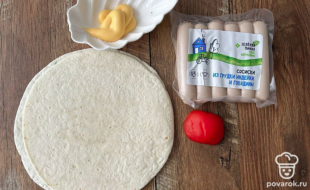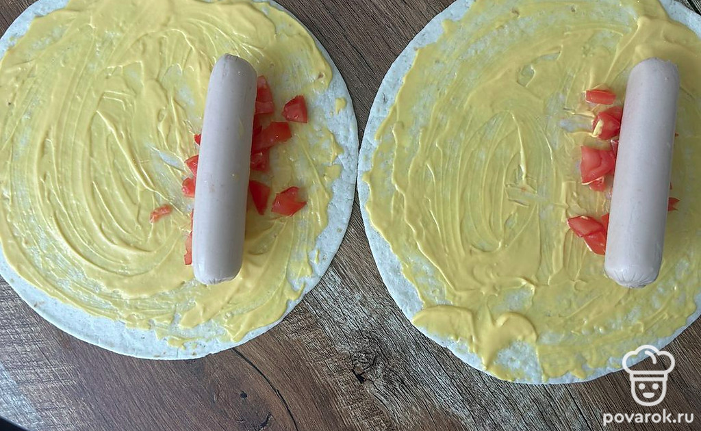 Помидор нарежьте кубиком, выложите полоской на тортилью. Сверху разложите сосиски.